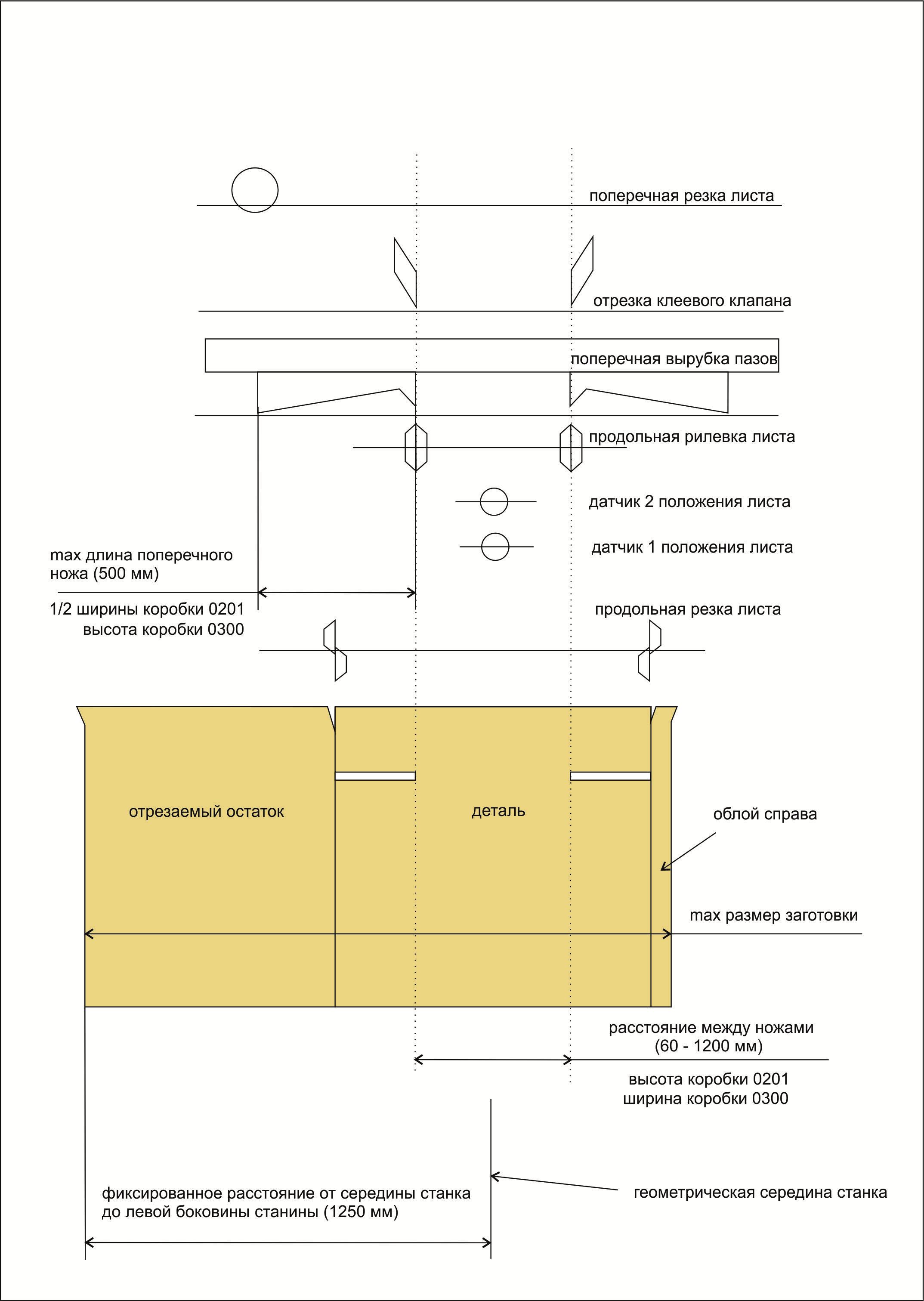 Продольная резка заготовки коробки по ширине осуществляется парными дисковыми тарельчатыми ножами на входе станка. При этом остаток (обрезок) остается деловым и может быть использован для других деталей. Обрезаемая полоса отводится мимо рабочей зоны, до входа в станок.