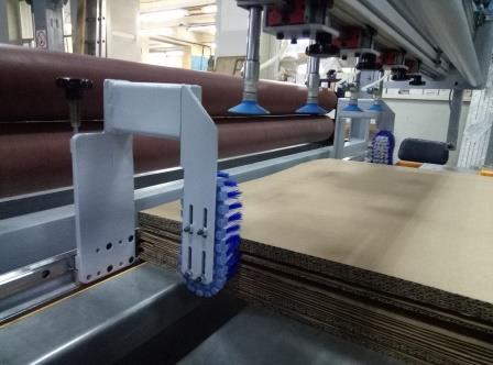 - В процессе работы присосок возможен захват одновременно двух и более листов, что нежелательно для безопасности работы машины. Чтобы предотвратить такую возможность, имеются боковые щетки-съемники, которые сбрасывают лишние заготовки при их вертикальном перемещении.