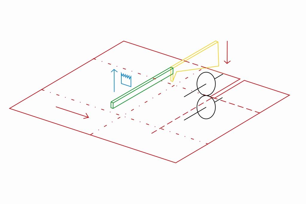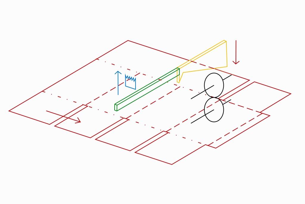 Процесс вырубки происходит прорезанием поперечных пазов в заготовке с одновременной поперечной и продольной биговками (рилевками).