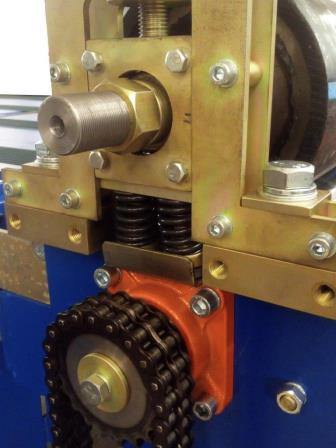 При вырубке на верхний вал действует нагрузка, равная усилию вырубки. Вал немного поднимается вверх (на величину люфта в регулировке зазора). После вырубки нагрузка резко падает до нуля - в этот момент вал опускается вниз. Если верхний вал "висит" на винтовой передаче и искусственно не поджат к верхней точке, т.е. не выбраны люфты, то при работе будут возникать ударные нагрузки на винтовые передачи. В наших прессах эта проблема решена конструктивно. Вал все время поджат к верхней точке за счет распорных пружин и ударов не возникает.